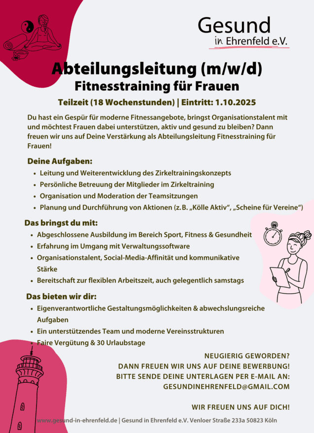 Du hast ein Gespür für moderne Fitnessangebote, bringst Organisationstalent mit und möchtest Frauen dabei unterstützen, aktiv und gesund zu bleiben? Dann freuen wir uns auf Deine Verstärkung als Abteilungsleitung Fitnesstraining für Frauen!