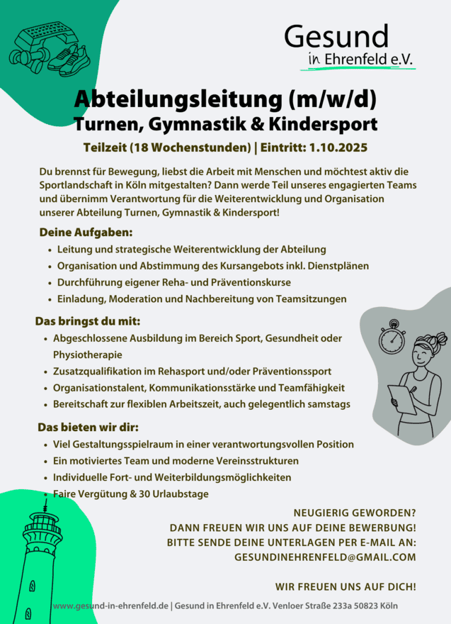 Du brennst für Bewegung, liebst die Arbeit mit Menschen und möchtest aktiv die Sportlandschaft in Köln mitgestalten? Dann werde Teil unseres engagierten Teams und übernimm Verantwortung für die Weiterentwicklung und Organisation unserer Abteilung Turnen, Gymnastik & Kindersport!